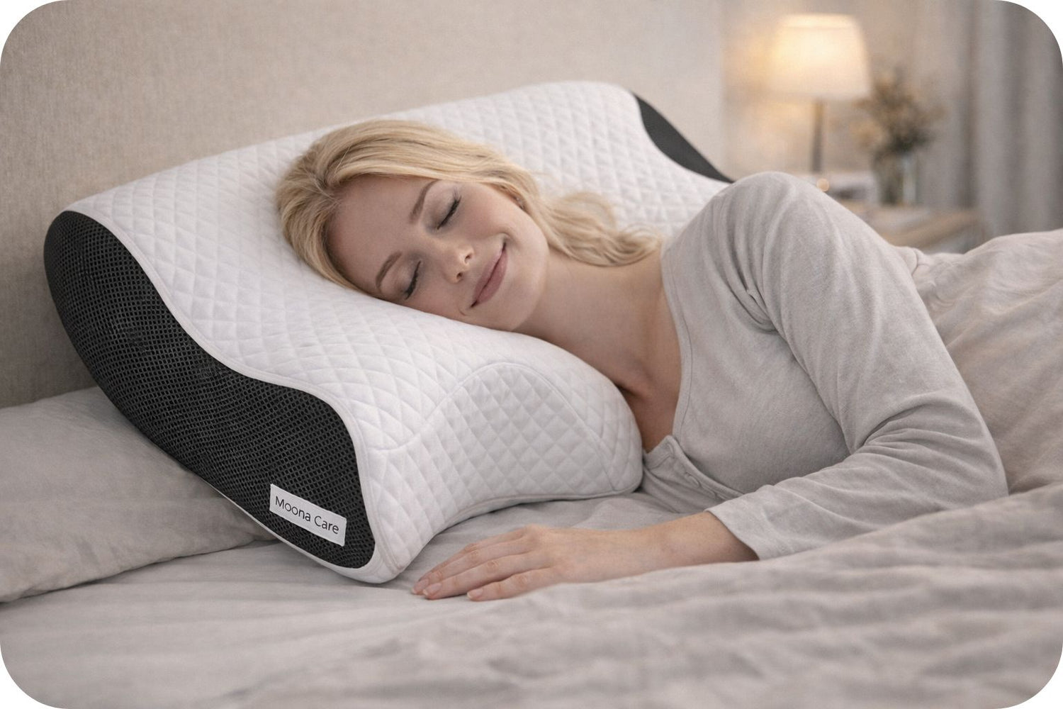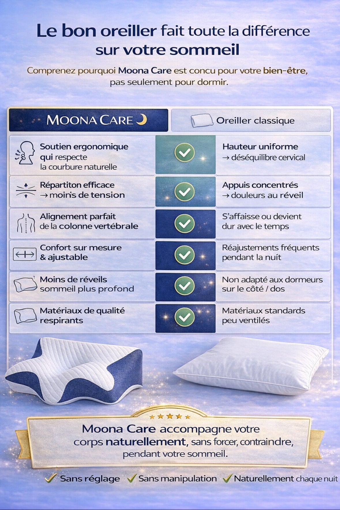 Contrairement aux oreillers classiques, Moona Care est conçu pour maintenir la colonne cervicale dans un alignement naturel toute la nuit.